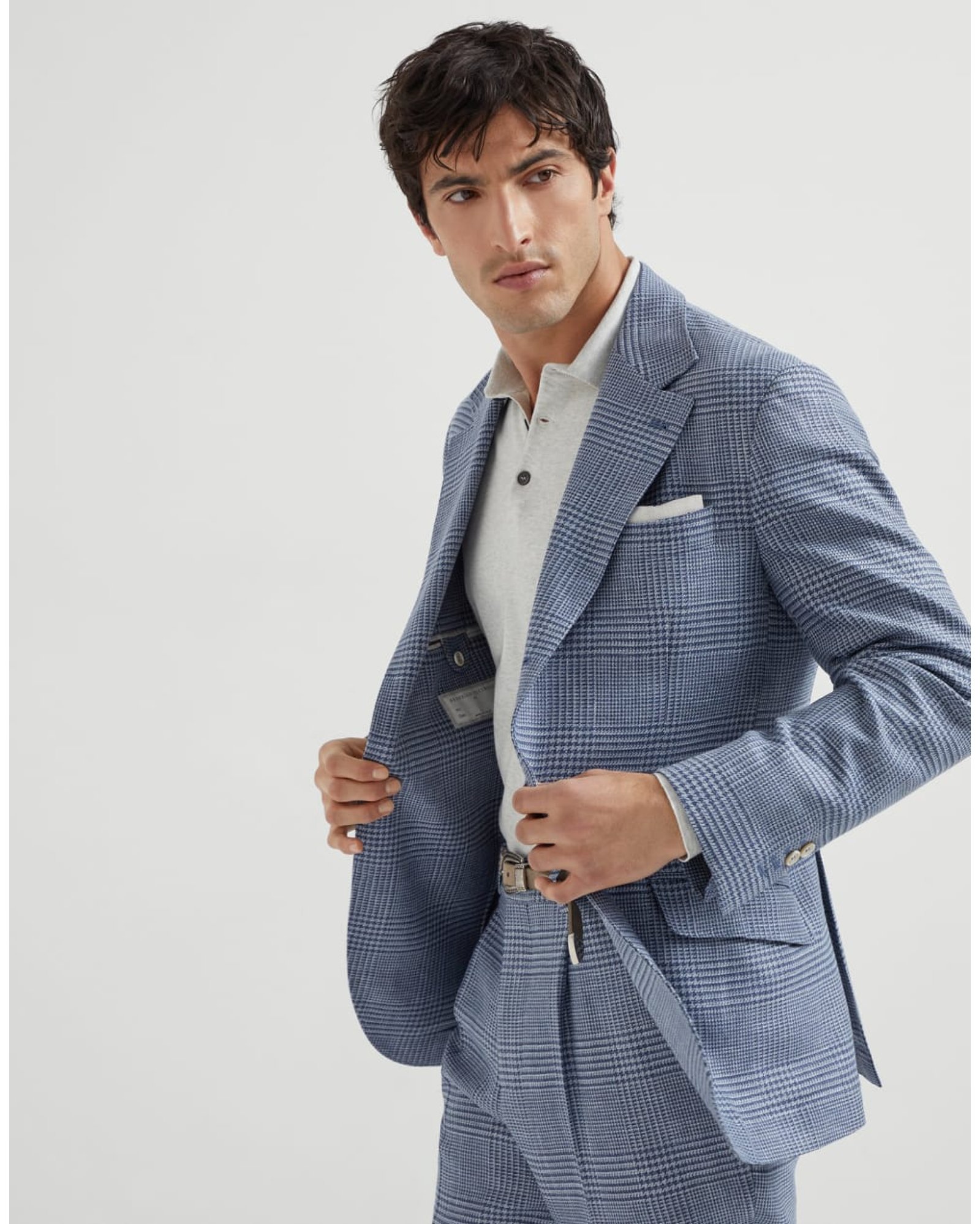 Innovative colors and versatile silhouettes define the contemporary feel of this deconstructed Cavallo blazer. Refined wool, silk, and linen fibers update the Prince of Wales pattern with a distinctive, slightly slubbed texture. The “Solomeo Shoulder”, named after the hamlet where the company is located, characterizes the Brunello Cucinelli blazer with signature proportions. The tapered and pronounced cut of the shoulder enhances the male physique without the need for padding.