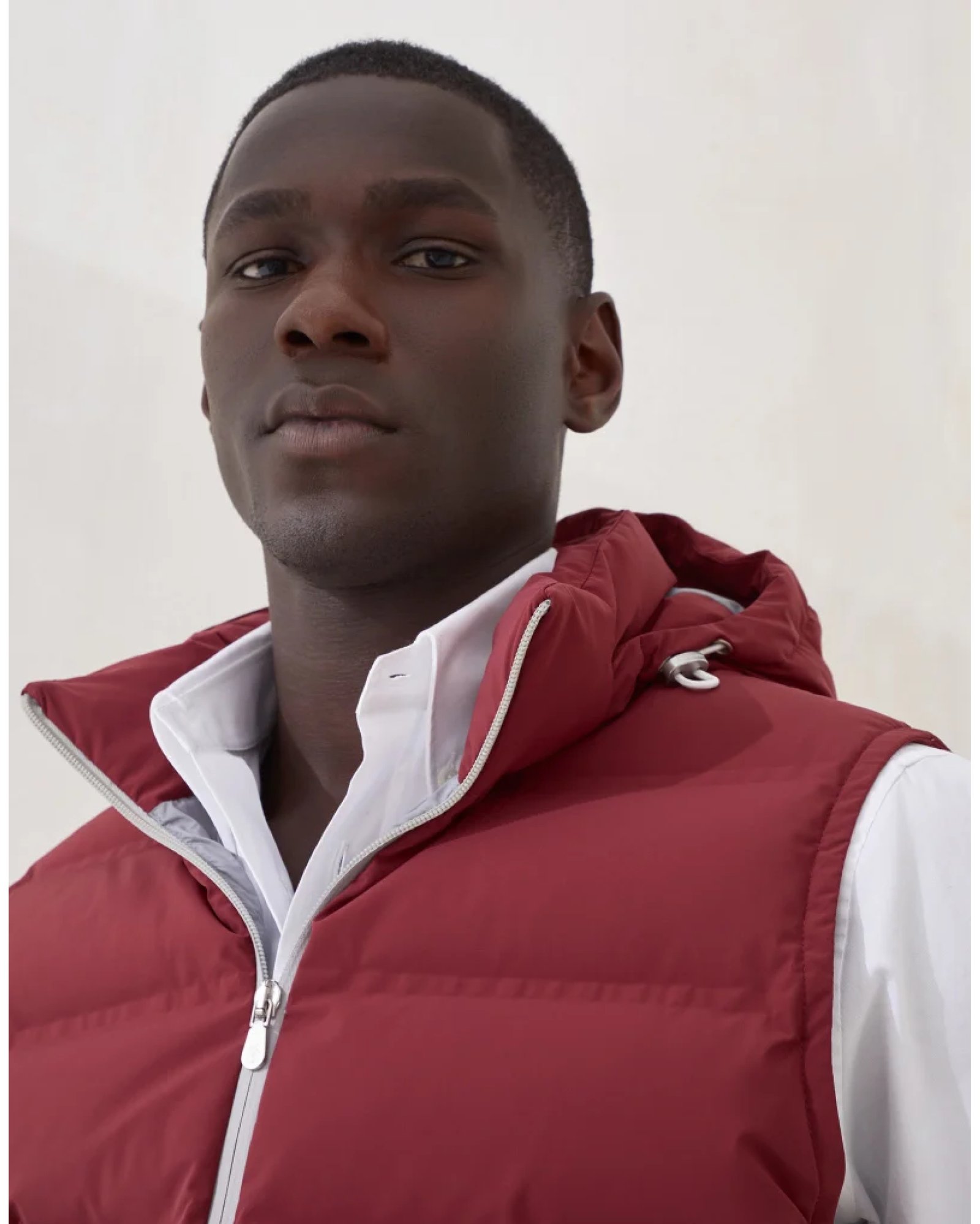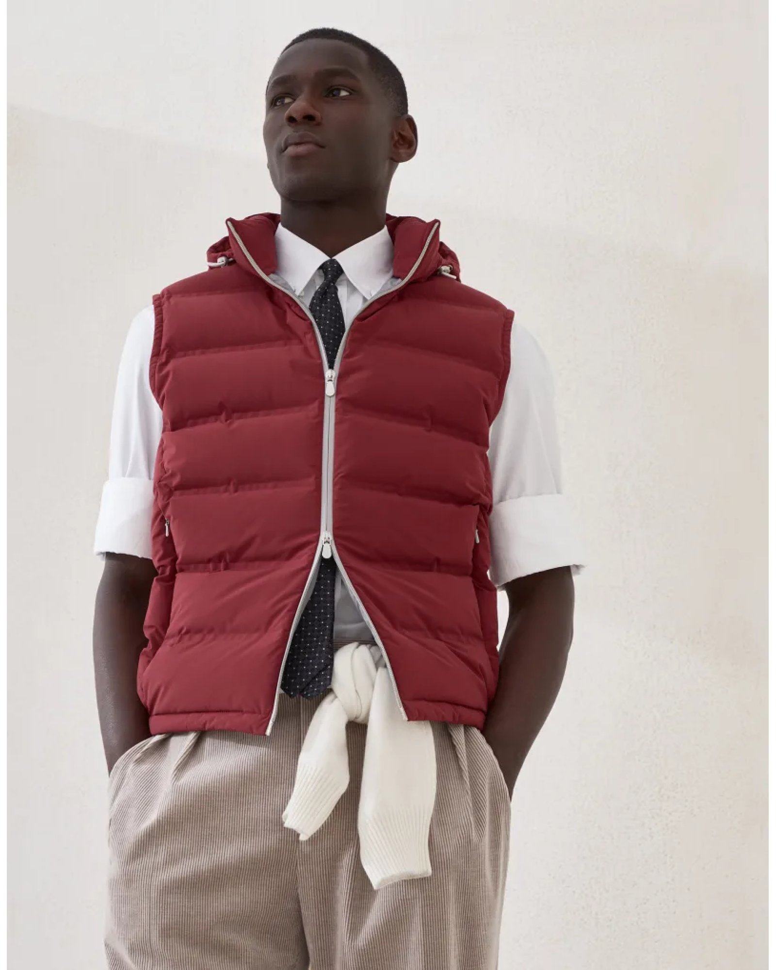 The quality of the materials and skillful techniques enhance the sporty feel of this down vest with detachable hood. The typical texture of taffeta, smooth and matte-looking, highlights the season’s nuances and enriches this quilted outerwear piece with heat-sealed profiles reminiscent of technical activewear, for a contemporary style. The inner membrane and light padding ensure comfort and protection.