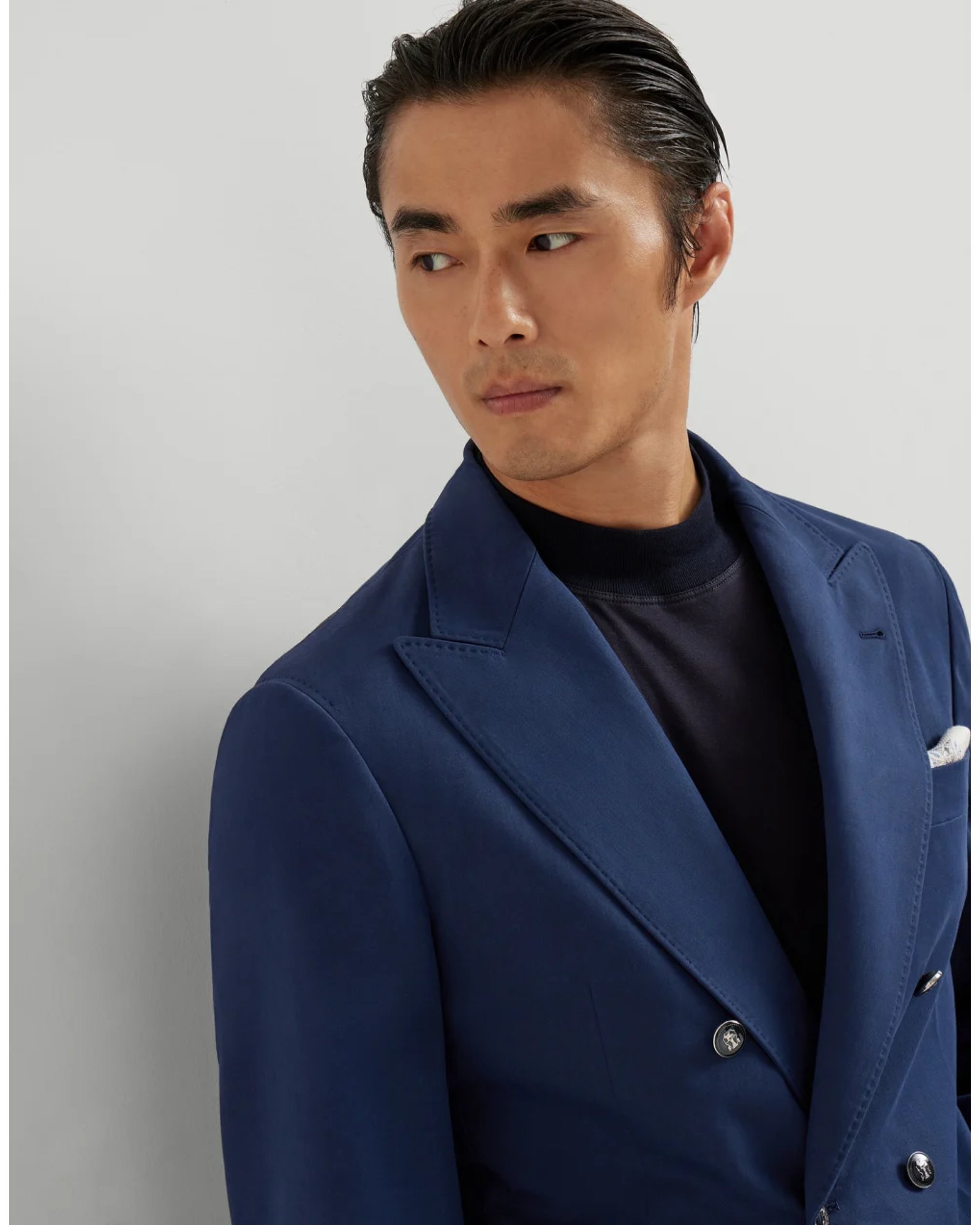 The measured elegance of details is paired with the excellence of yarns and defines the look of this comfort cotton and cashmere gabardine deconstructed blazer. The fabric's unmistakable diagonal weave runs through and brings to life the modern silhouette of the one-and-a-half-breasted blazer with metal buttons. The “Solomeo Shoulder”, named after the hamlet where the company is located, characterizes the Brunello Cucinelli blazer with signature proportions. The tapered and pronounced cut of the shoulder enhances the male physique without the need for padding.