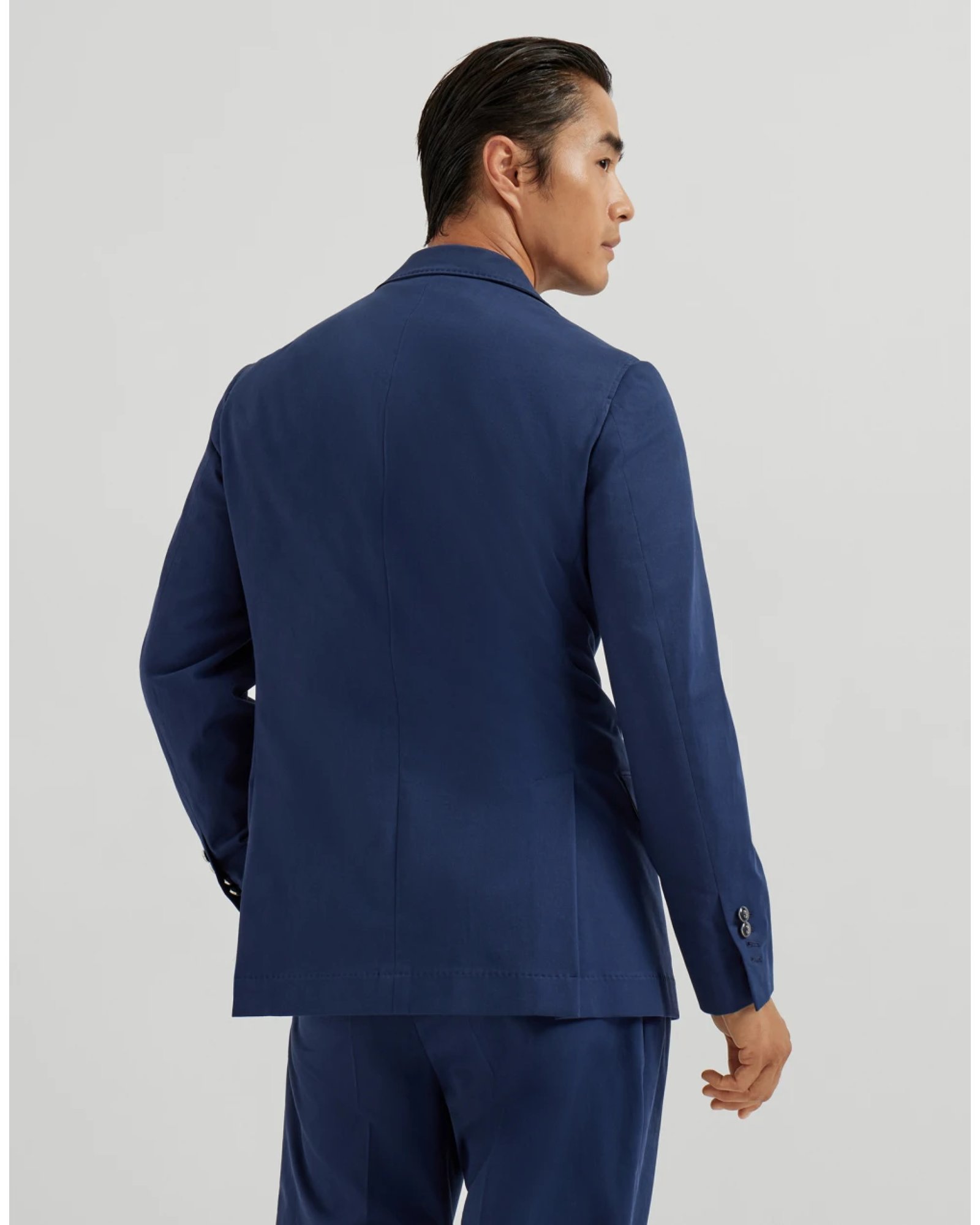The cotton and cashmere gabardine is a refined fabric, characterized by a soft hand and a classic diagonal structure, enhanced by a small percentage of elastic fiber to ensure an impeccable fit. The ultra-lightweight cupro half lining completes the garment.
