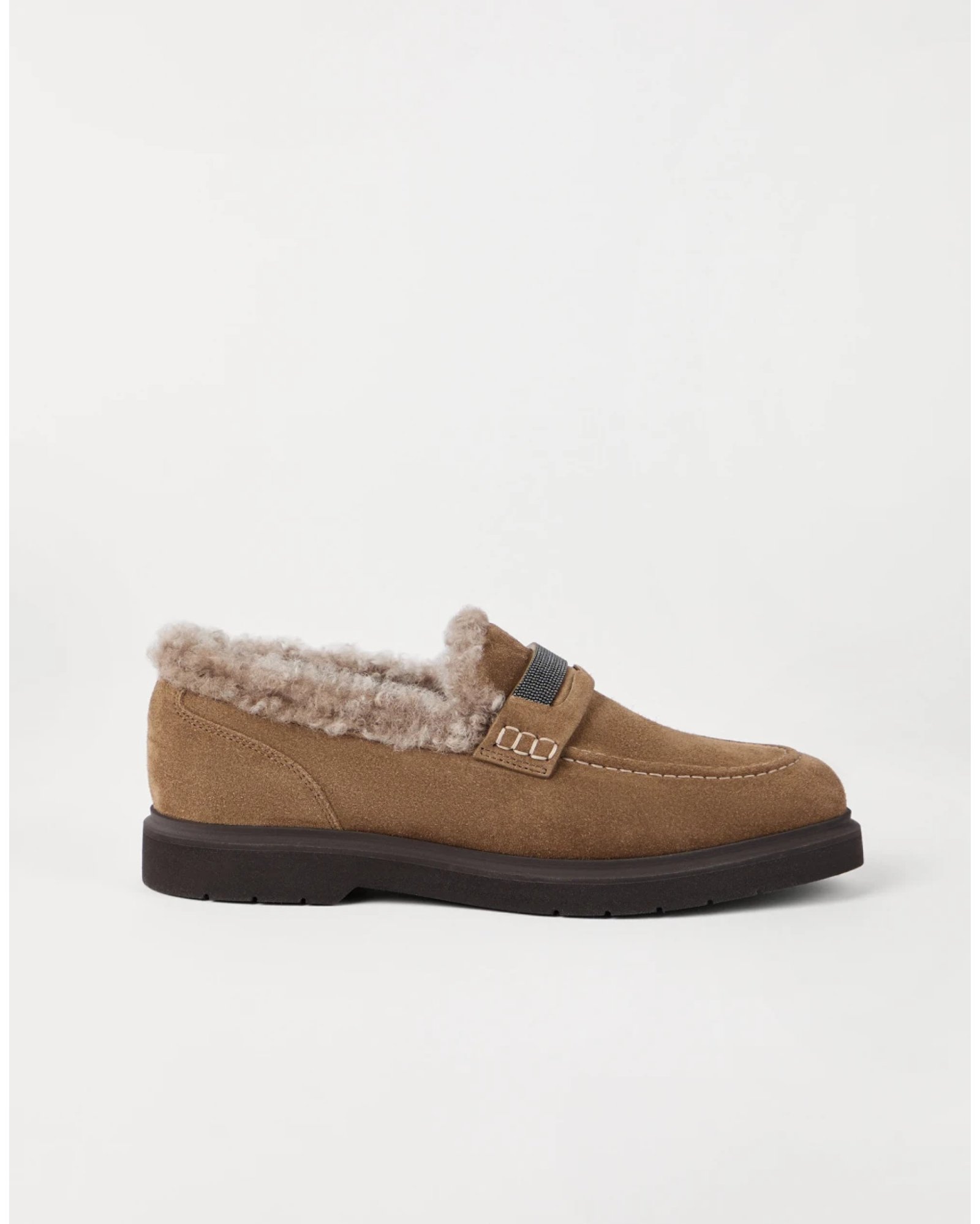 Refined materials and sparkling embellishments reinterpret the menswear inspiration of these Penny Loafers with a modern, elegant feel. The velvety texture of suede lends a refined note to the footwear, while the soft shearling lining adds a sophisticated styling detail and ensures warmth and comfort. The welt is enriched with a sparkling strap embroidered in shiny monili, the iconic embellishment of the Brunello Cucinelli collections.