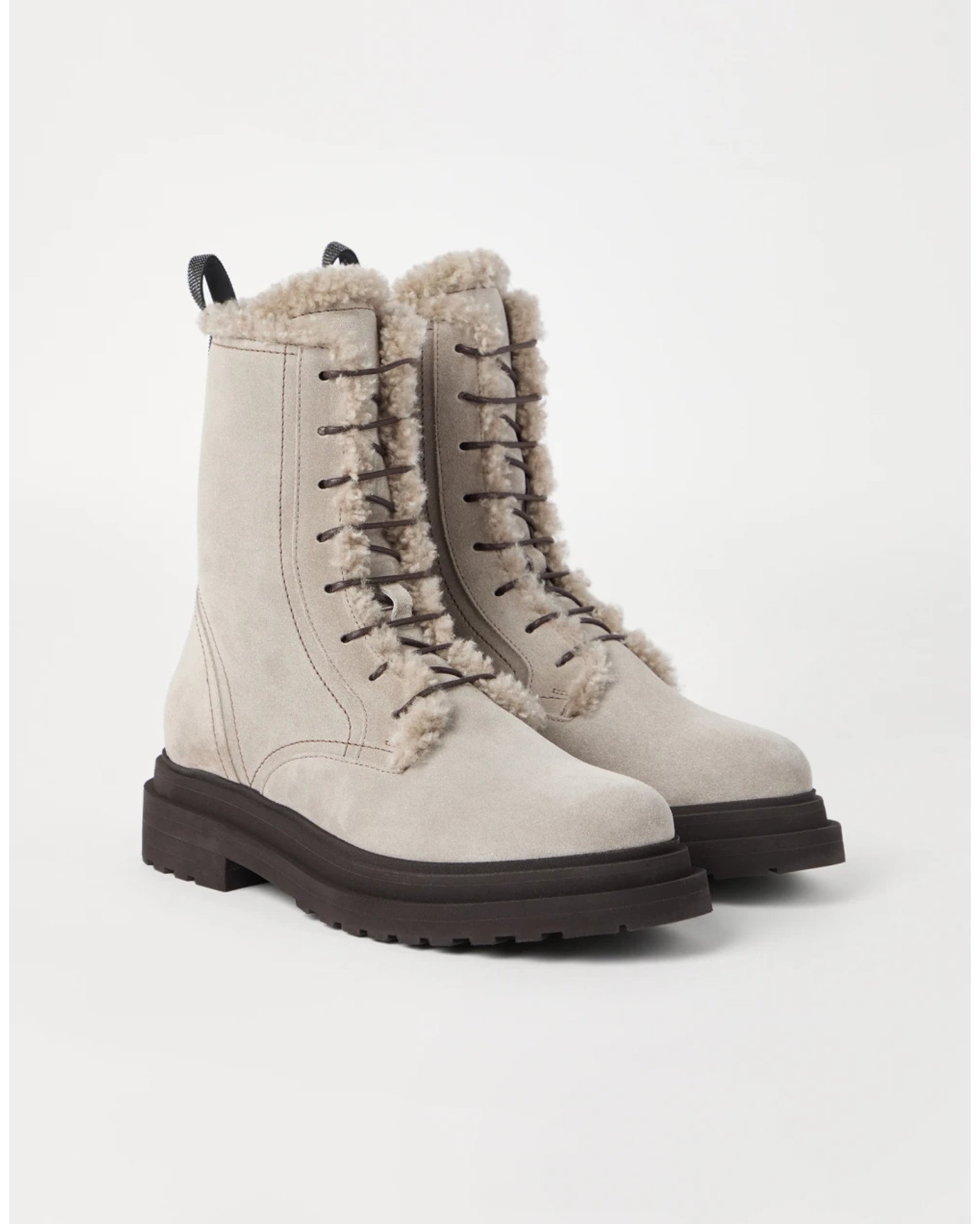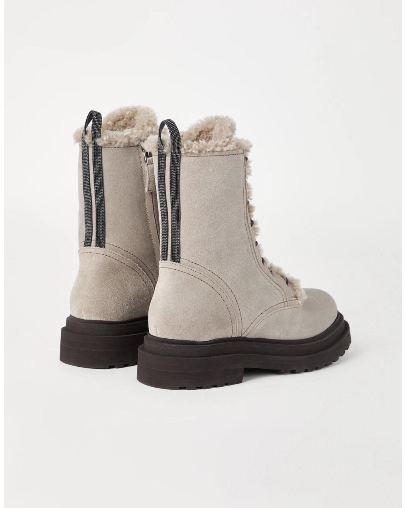 A contemporary design and feminine details define the elegant style of these new boots. Fine suede, with a soft and velvety hand, meets the plush shearling lining, highlighting the distinctly wintry feel of the design, characterized by the typical combat boot lace-up. A double loop on the back is illuminated with a shiny monili embroidery, the iconic embellishment of the Brunello Cucinelli collections.