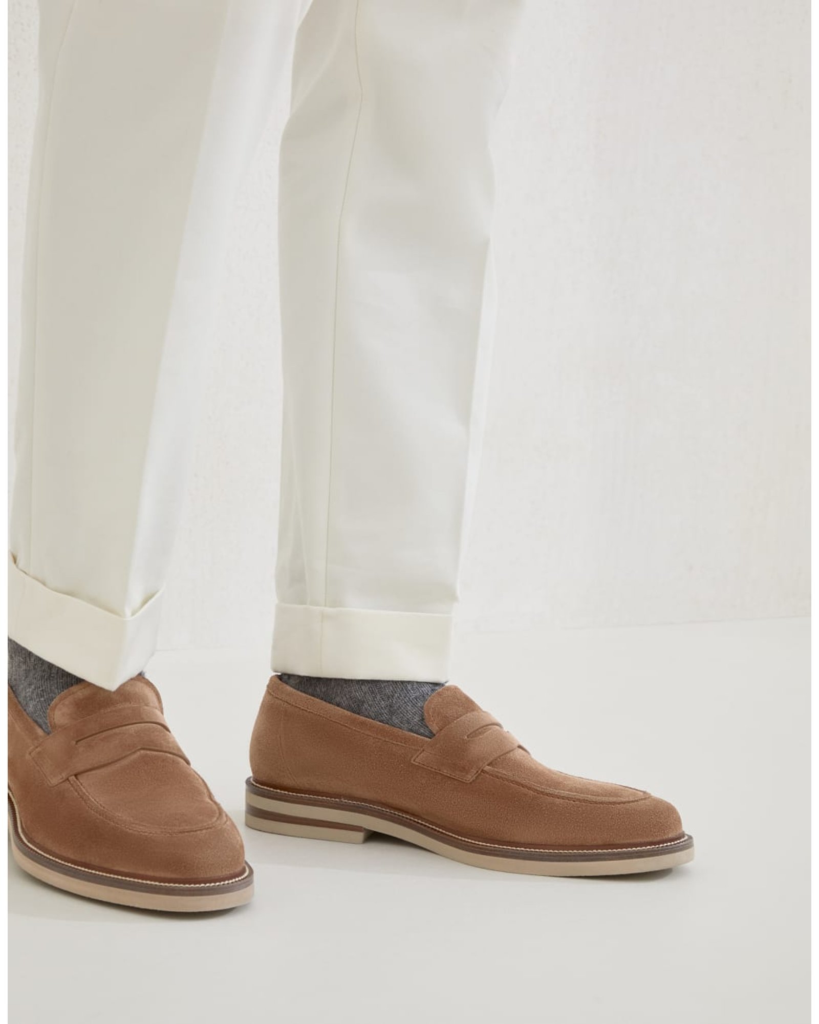 The iconic silhouette of these suede penny loafers is paired with the timeless allure of the loafer with the quality of refined suede. The smooth, velvety leather enhances the season’s colors and the casual feel of the footwear, which ensures comfort thanks to the lightweight construction, leather lining and rubber bottom.