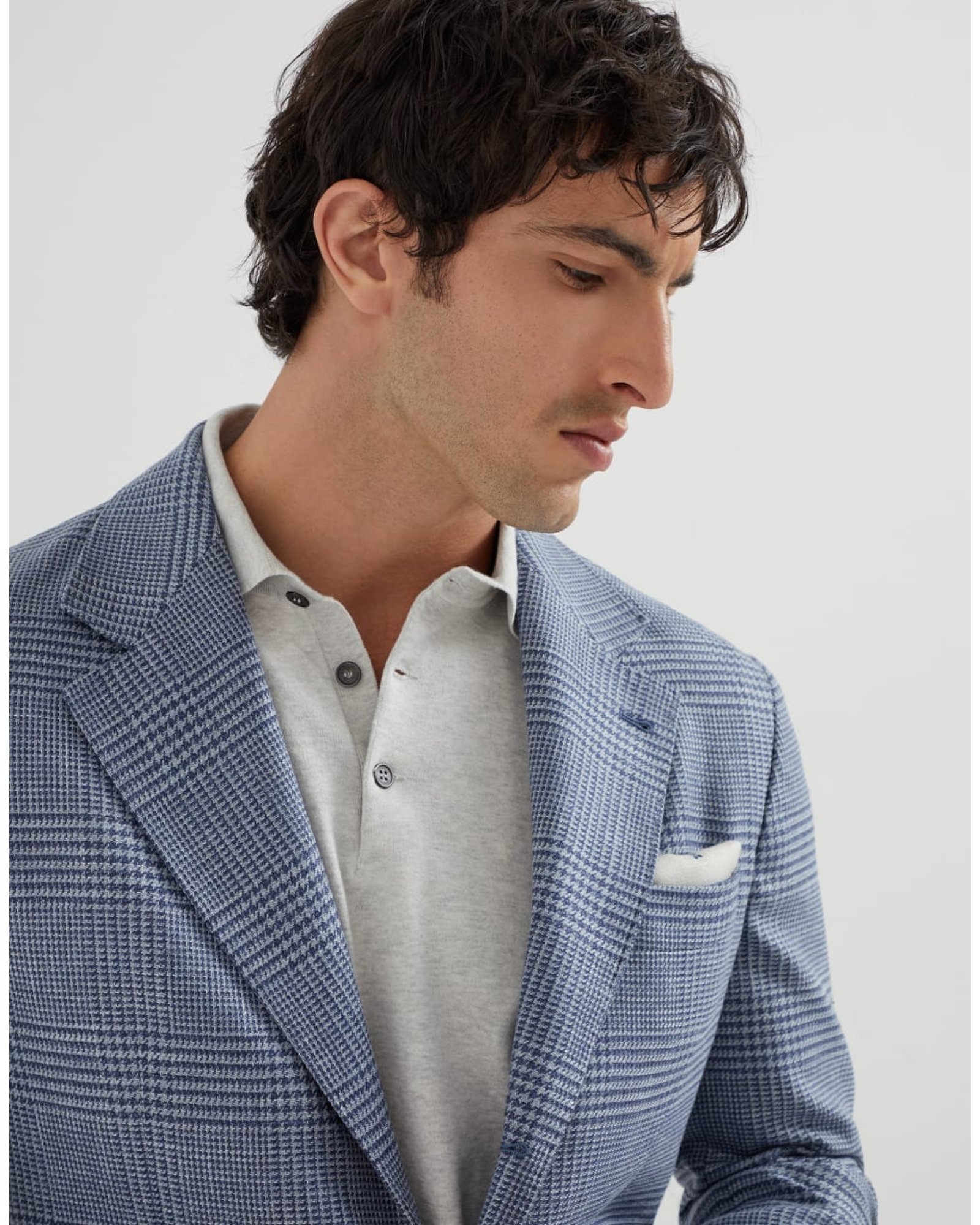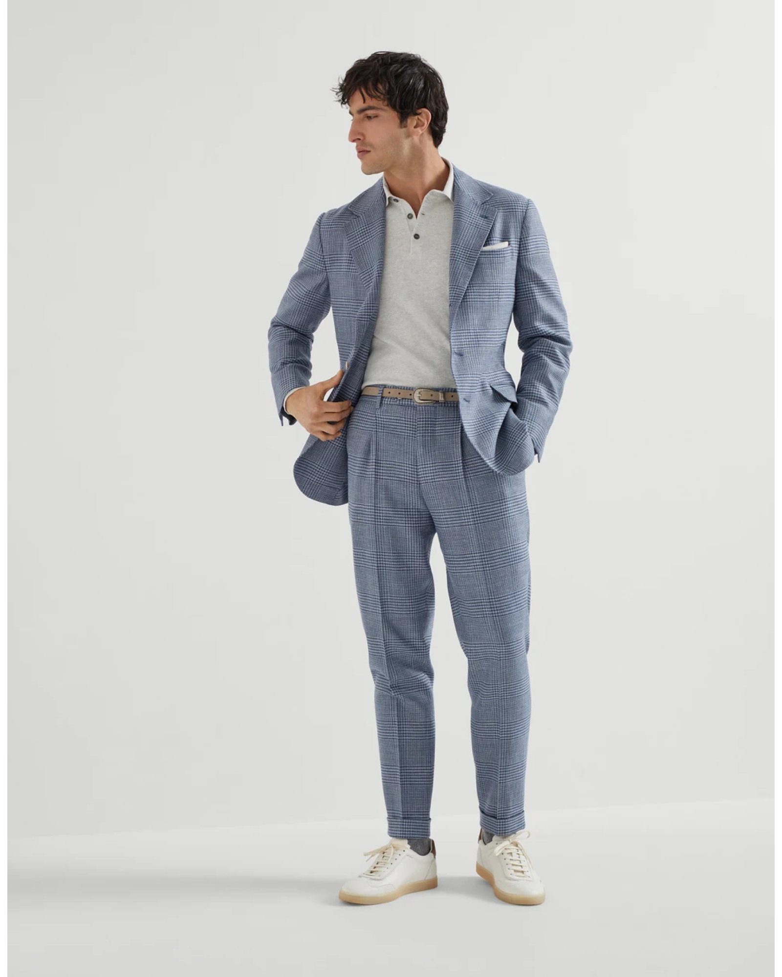 Innovative colors and versatile silhouettes define the contemporary feel of this deconstructed Cavallo blazer. Refined wool, silk, and linen fibers update the Prince of Wales pattern with a distinctive, slightly slubbed texture. The “Solomeo Shoulder”, named after the hamlet where the company is located, characterizes the Brunello Cucinelli blazer with signature proportions. The tapered and pronounced cut of the shoulder enhances the male physique without the need for padding.