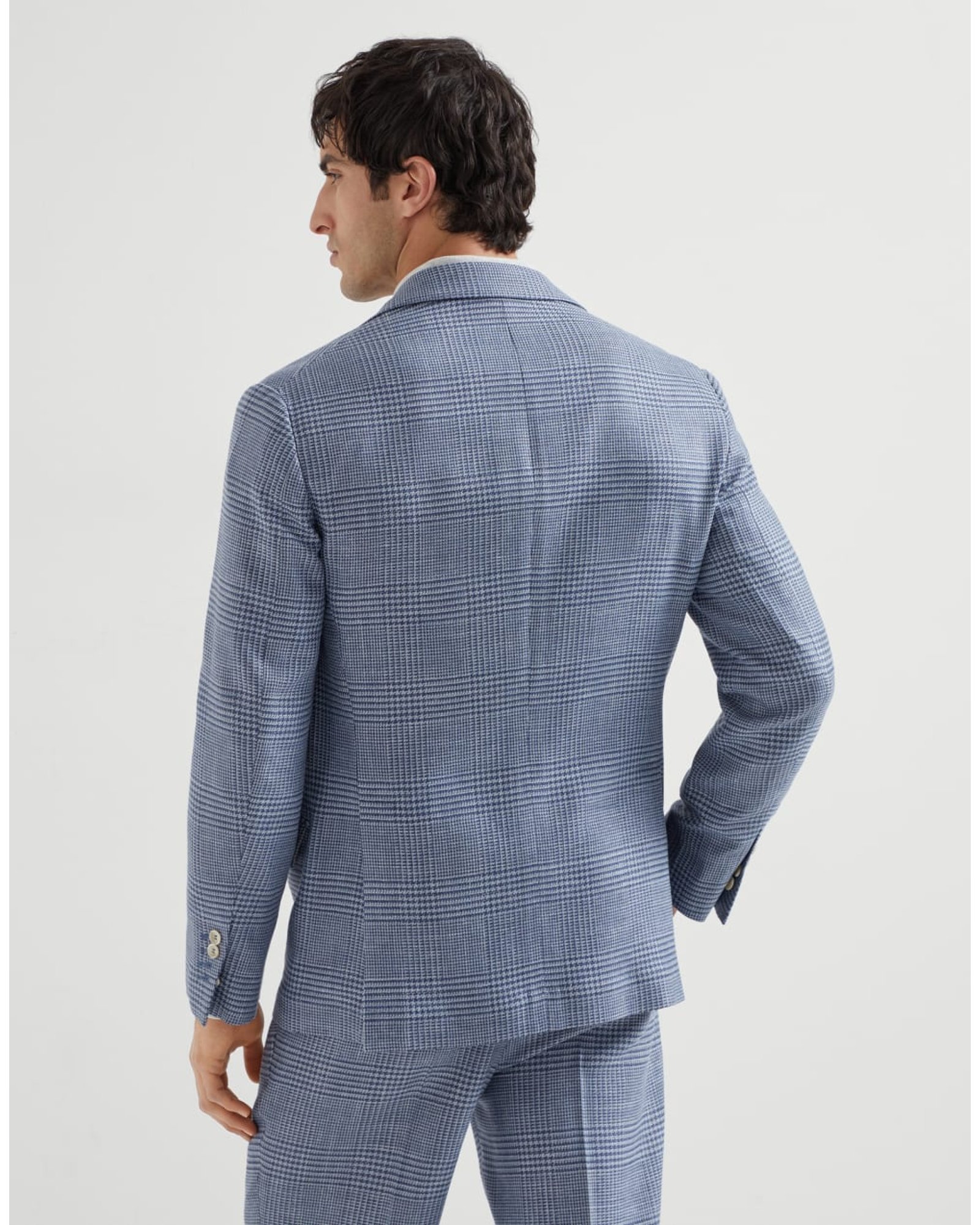 The fabric undergoes a special treatment that gives the garment a relaxed, elegant look. The material’s double dyeing creates a mélange effect that softens the Prince of Wales pattern and makes the color slightly irregular. The comfort linen component enhances the texture with a subtle slubbed effect, for a distinctive look.