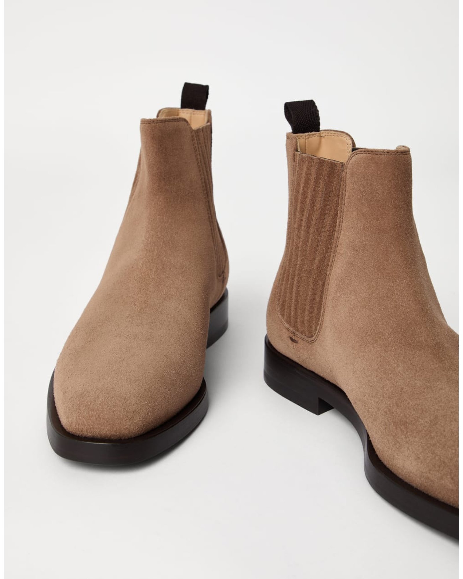 Refined and contemporary Brunello Cucinelli style interprets the look of the Chelsea boot, an iconic style of male elegance. The upper displays the suede’s velvety texture and is completed by the contrast color elastic side panels that make wearing easy. Balanced with the boots’ tapered lines, the bottom is made up of a thin leather layer and a lightweight rubber tread.