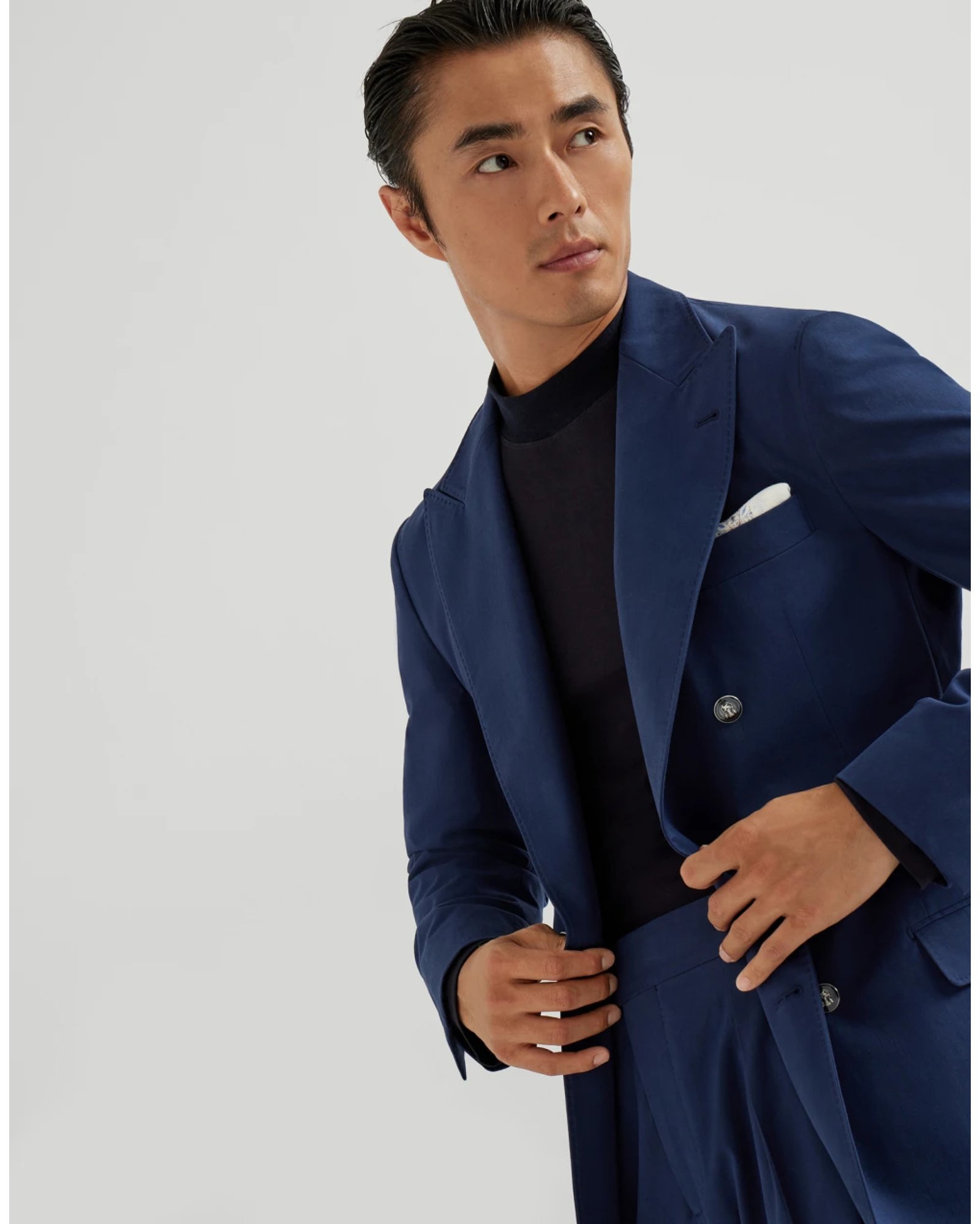The measured elegance of details is paired with the excellence of yarns and defines the look of this comfort cotton and cashmere gabardine deconstructed blazer. The fabric's unmistakable diagonal weave runs through and brings to life the modern silhouette of the one-and-a-half-breasted blazer with metal buttons. The “Solomeo Shoulder”, named after the hamlet where the company is located, characterizes the Brunello Cucinelli blazer with signature proportions. The tapered and pronounced cut of the shoulder enhances the male physique without the need for padding.
