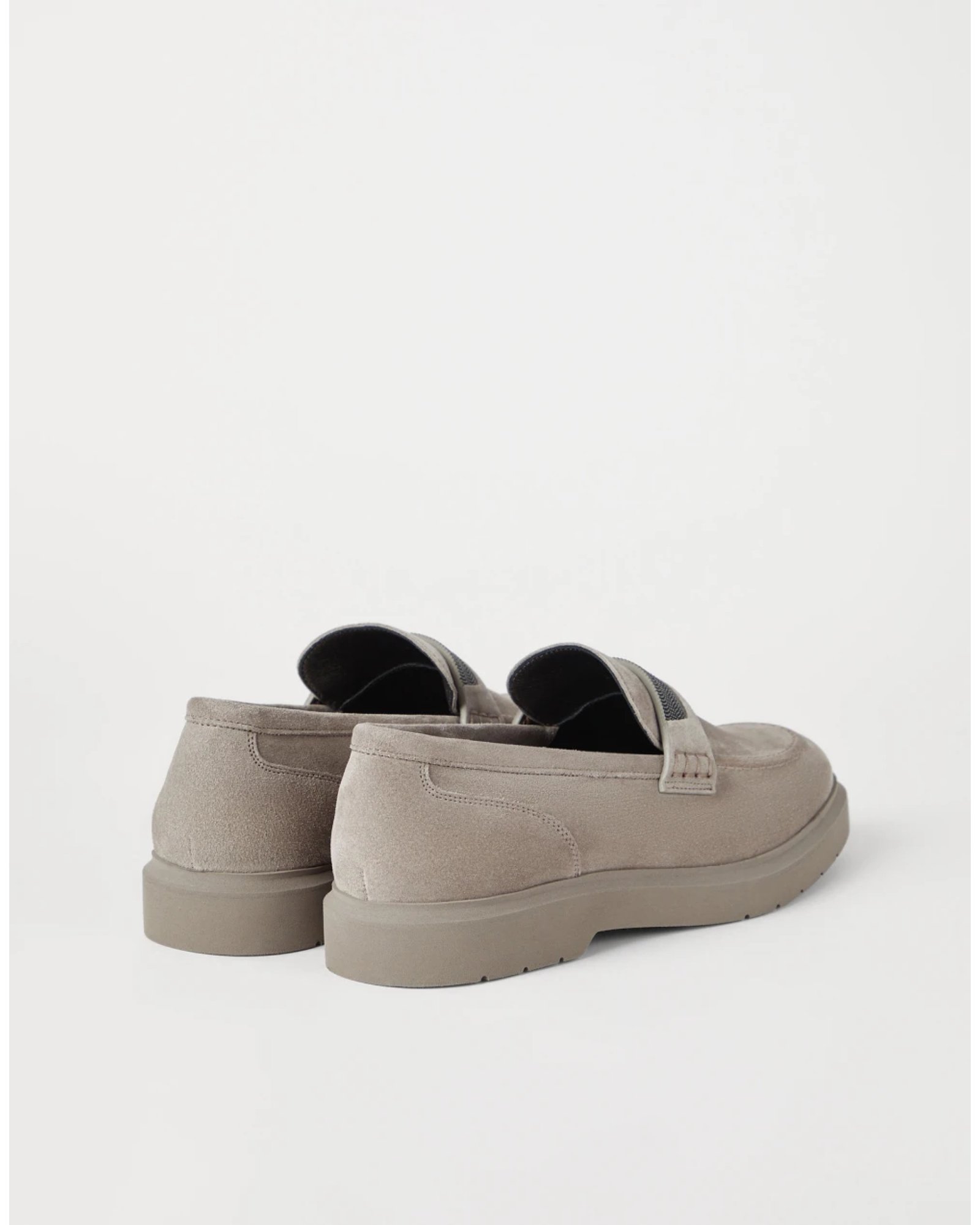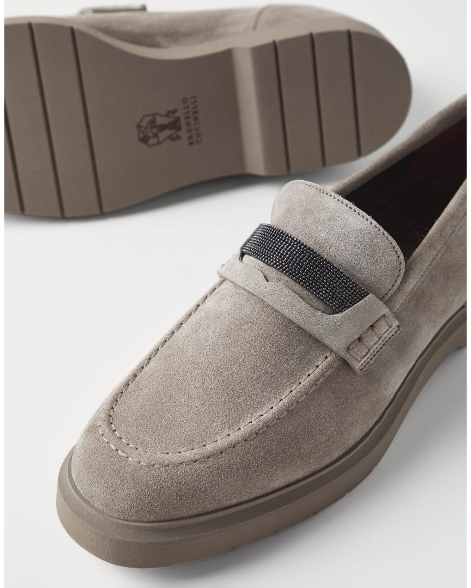 The light construction of a sneaker is paired with traditional loafer details to give life to elegant footwear that is dynamic at the same time. The texture of suede creates a velvety feel, while the horizontal band made of rows of shiny monili introduces a radiant sparkling note. The lightweight monochromatic rubber outsole adds a casual touch, in addition to enhancing comfort.