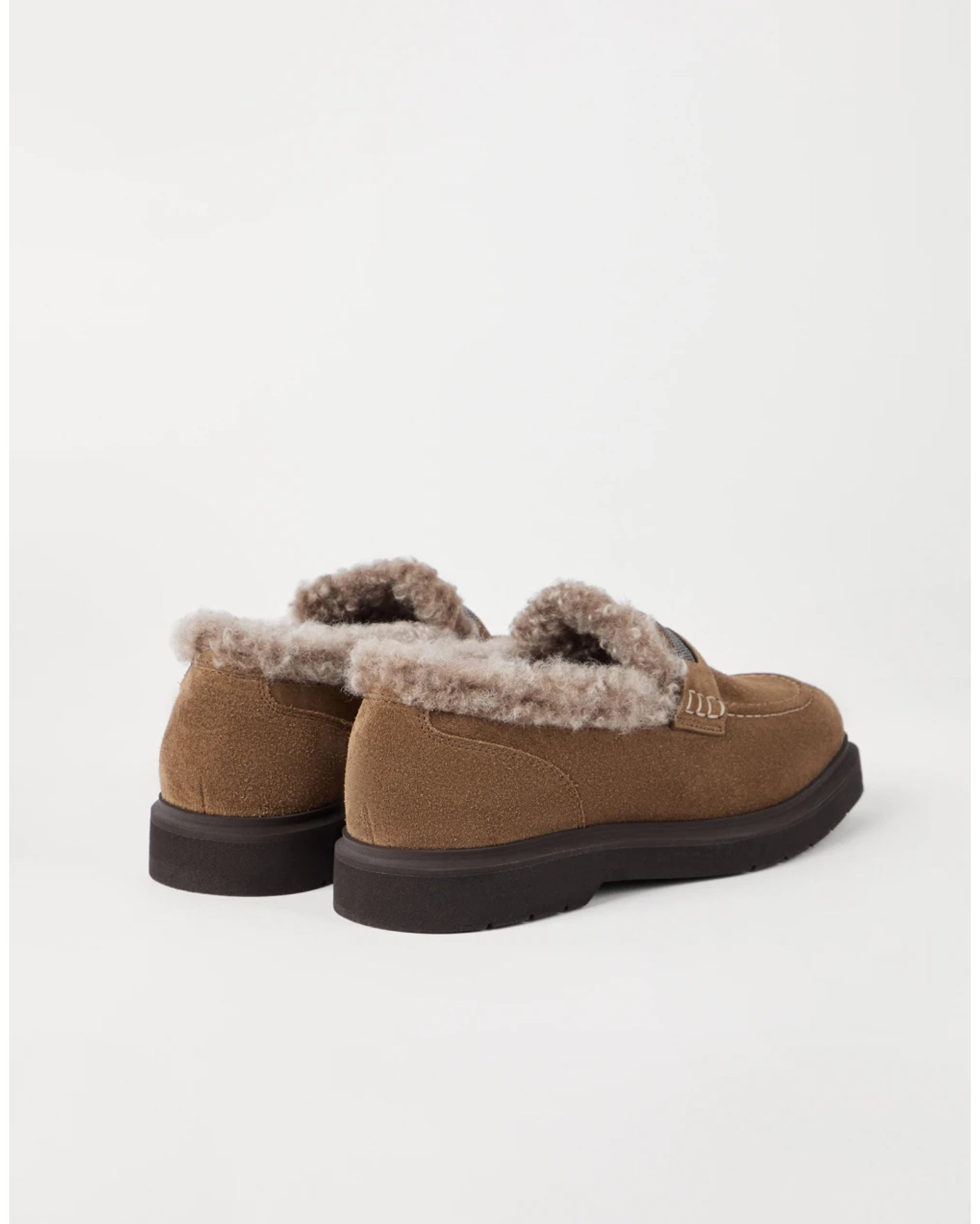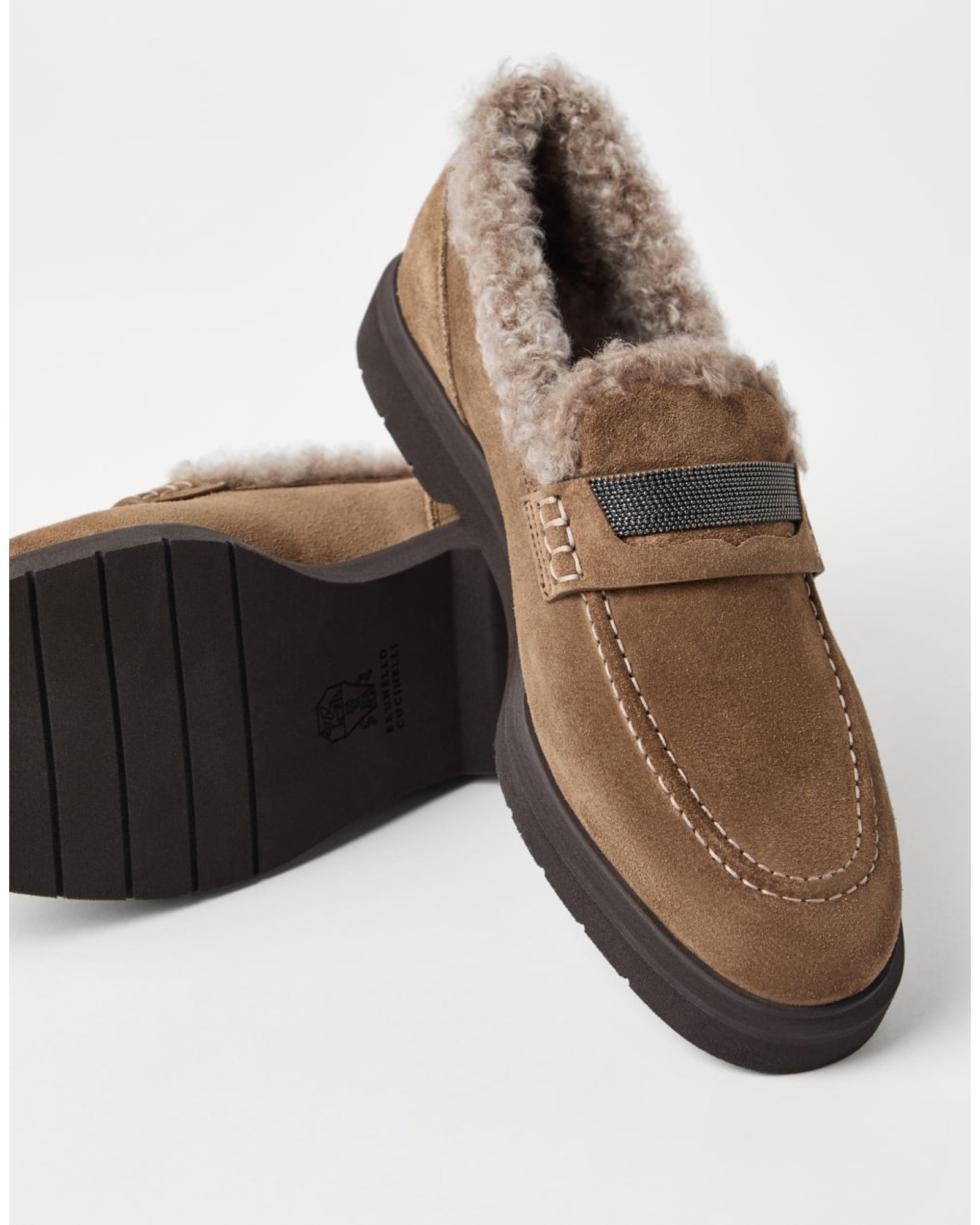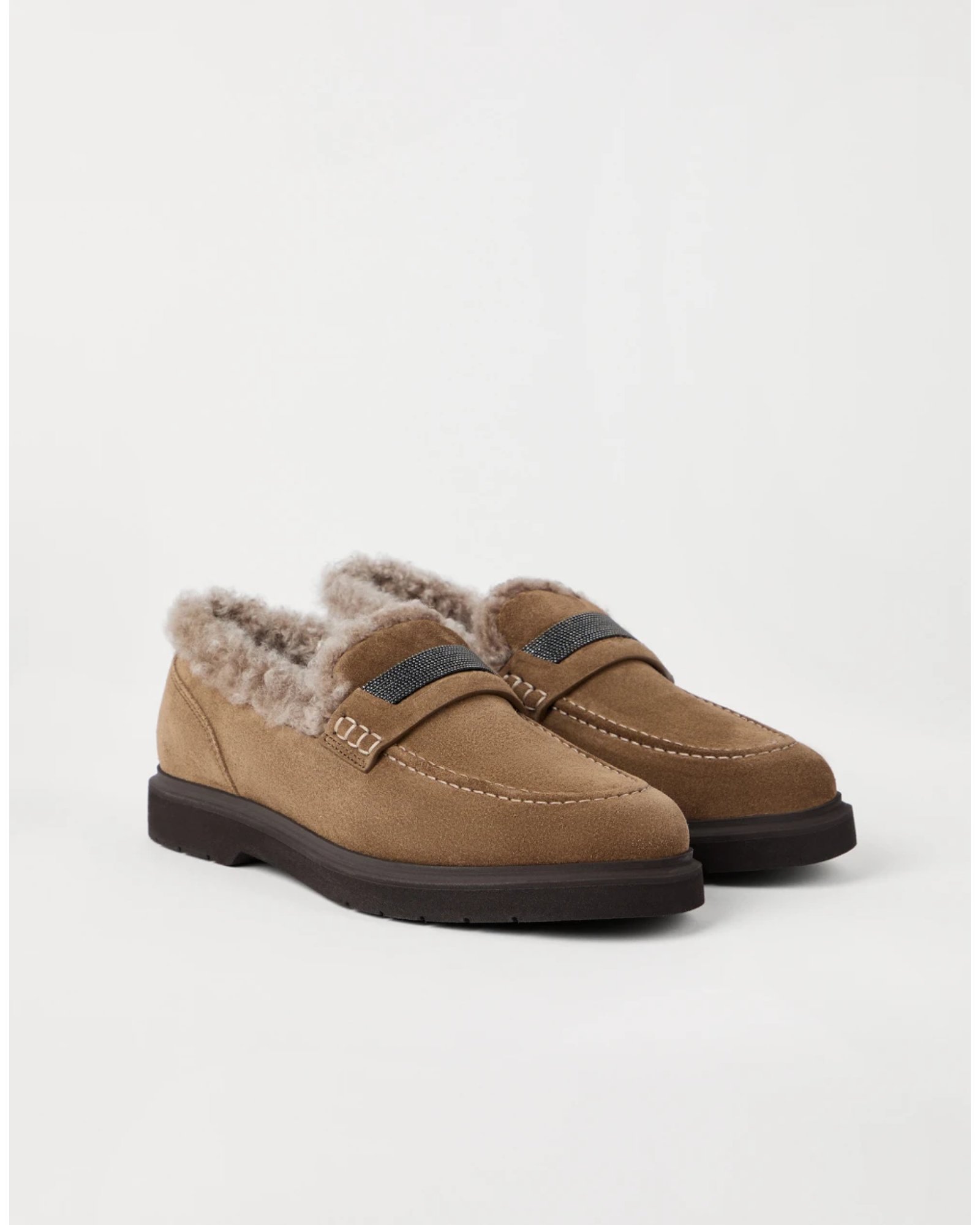 Refined materials and sparkling embellishments reinterpret the menswear inspiration of these Penny Loafers with a modern, elegant feel. The velvety texture of suede lends a refined note to the footwear, while the soft shearling lining adds a sophisticated styling detail and ensures warmth and comfort. The welt is enriched with a sparkling strap embroidered in shiny monili, the iconic embellishment of the Brunello Cucinelli collections.