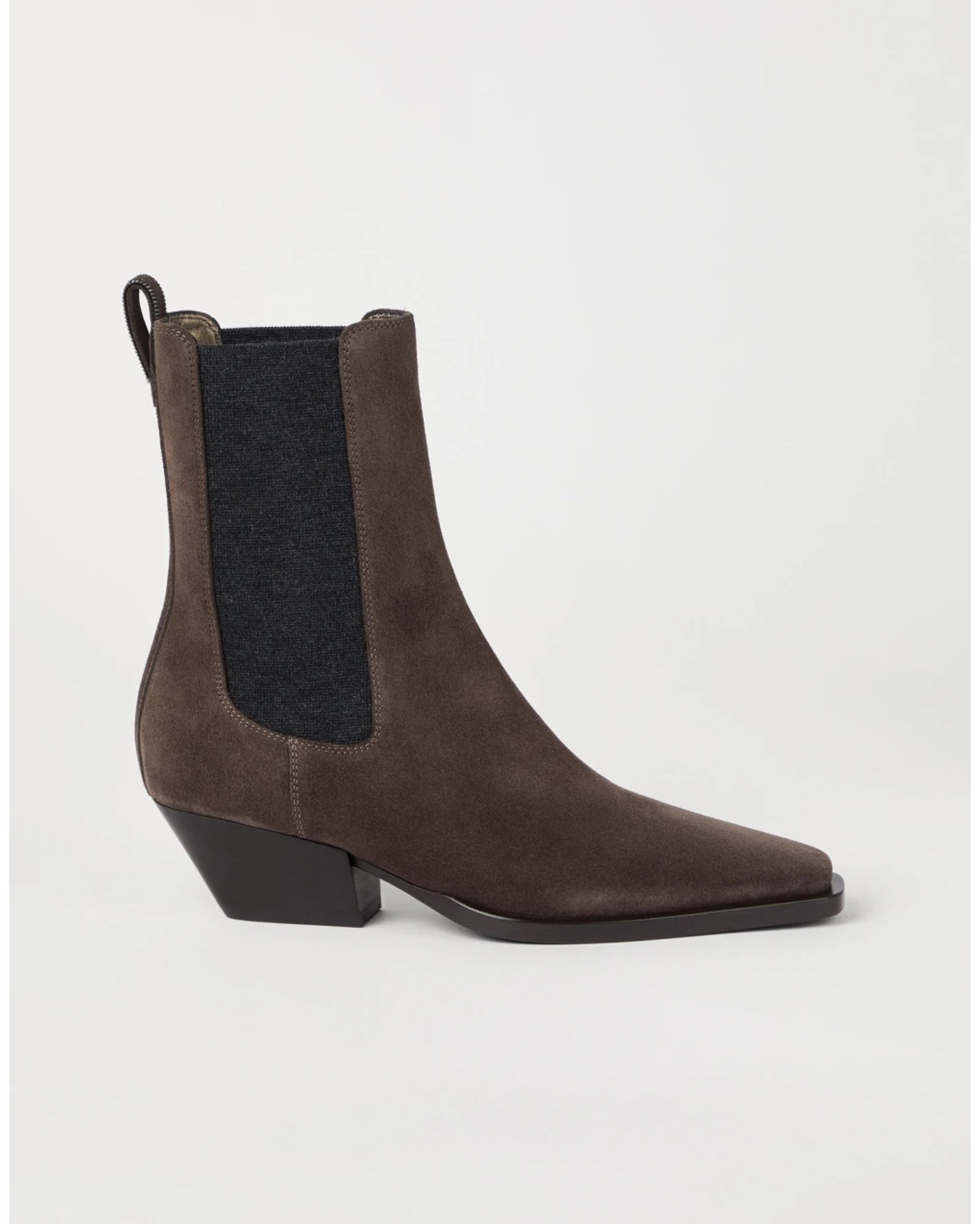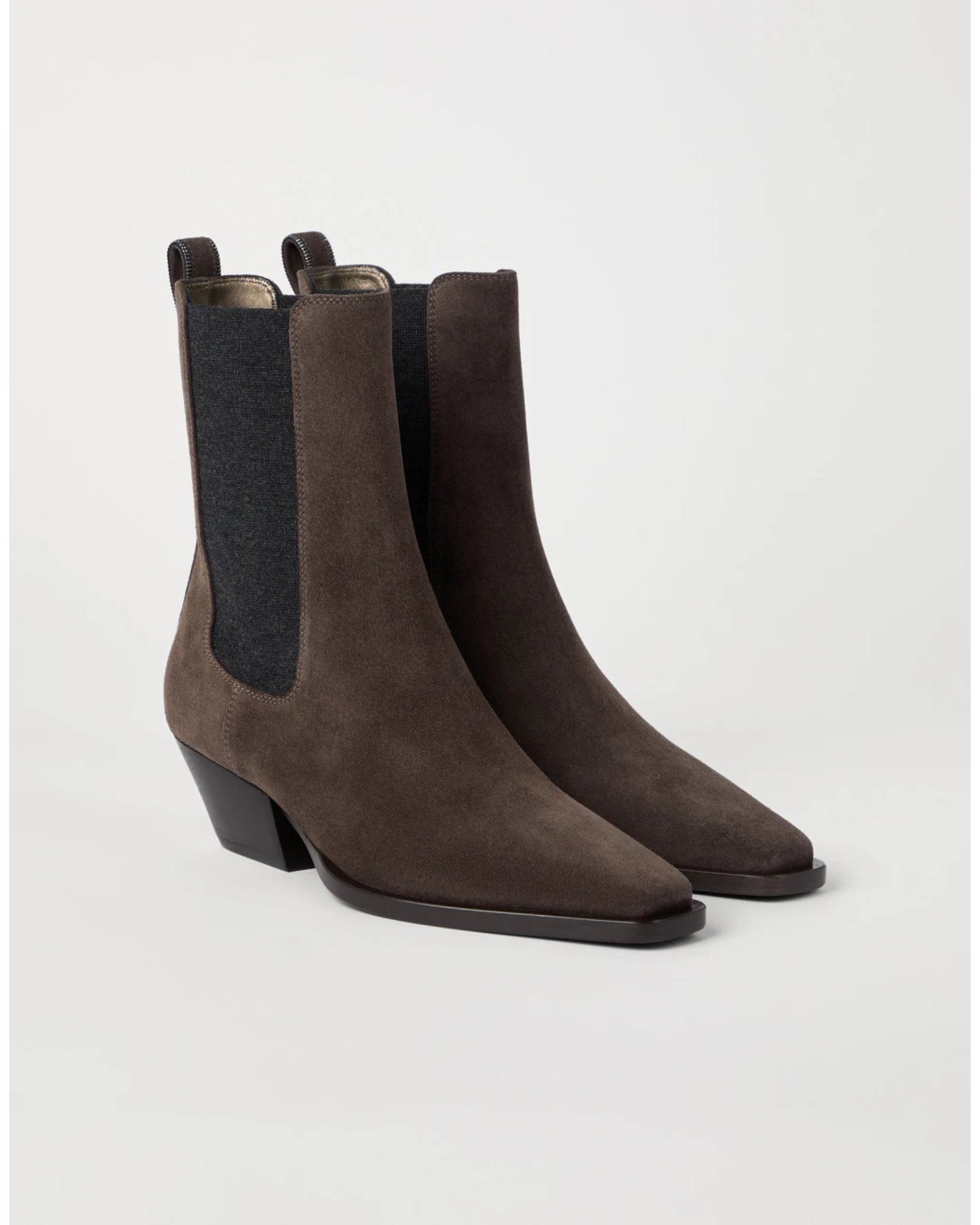 These new suede Chelsea boots represent the perfect mix of comfort and femininity. The tapered silhouette features a slightly squared toe and an angled heel, both country-inspired, interpreted in a very elegant way. A double loop on the back is illuminated with a shiny monili embroidery, the iconic embellishment of the Brunello Cucinelli collections.